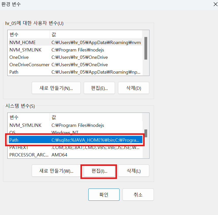 2. 시스템 환경변수 편집에서 환경변수 > Path를 클릭하고 새로 만들기를 클릭하여 C:\sqlite를 추가합니다.